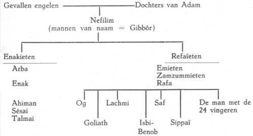 We kunnen hier nog aan toevoegen dat de Arabieren en de Koran van een reuzenras « Ad » spreken (7:63, 67; 26:123; 41:14; 89:5). Deze wezens waren hoogmoedig en werden uitgeroeid. Uit de aanduidingen die de Schrift ons geeft aangaande de Nefilim, de Refaïeten, de Enakieten en anderen, kunnen we de volgende geslachtsboom samenstellen: